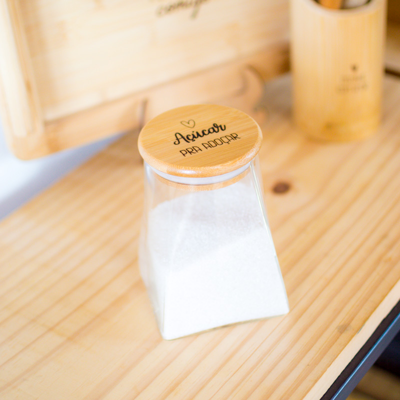 Os Potes Herméticos Scalene de vidro e tampa em madeira personalizada são ideais para guardar café, açúcar, farinha, achocolatado em pó e outros alimentos. Vedação com silicone e não entra ar, protegendo o alimento corretamente, fazendo durar mais tempo.